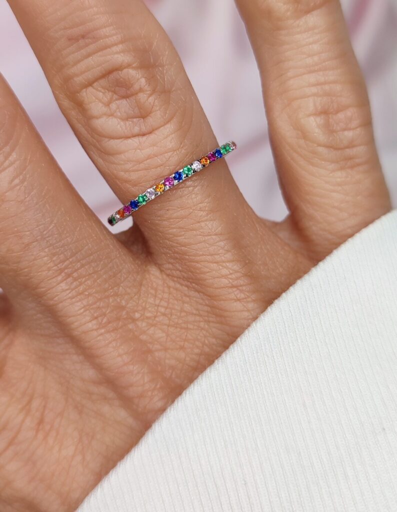 Prsten Šareni Cirkoni je tanak, nežan i idealan za svakodnevno kombinovanje. Ukrašen je raznobojnim cirkonima koji unose živost i daju poseban, razigran sjaj pri svakom pokretu ruke.