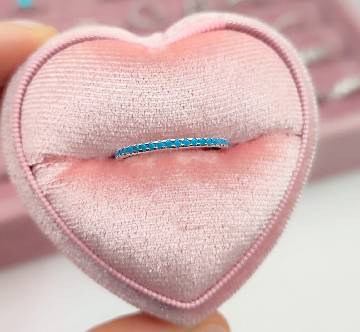 Prsten Tirkiz izrađen je od kvalitetnog srebra 925 i krase ga prelepi plavi cirkoni koji podsećaju na tirkiznu nijansu mora. Njegov tanak i suptilan dizajn čini ga elegantnim, laganim i savršenim za svakodnevno nošenje.